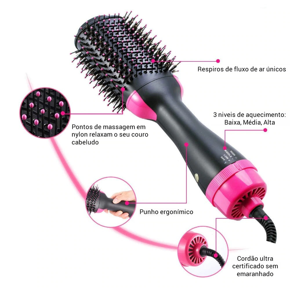 O ar frio entra pela parte de baixo e o ar quente sai por dentro da escova, unindo a tecnologia dos íons que retira o frizz e a estática, evitando cabelos arrepiados no seu visual.