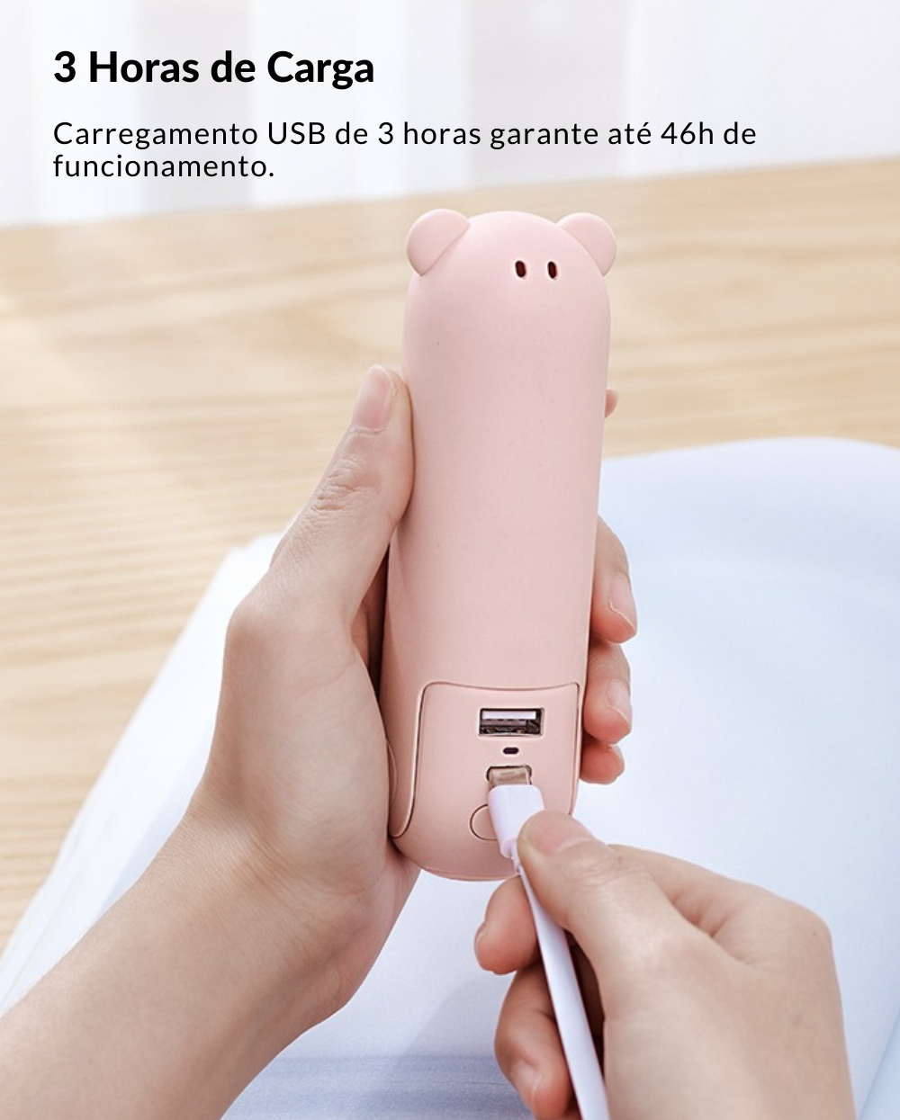 O TeddyFan possuí 3 velocidades e é recarregável via USB. É ideal para levar para o trabalho, pois ainda conta com uma lanterna super útil e pode ser usado como um carregador power bank para o seu celular não deixar você na mão.